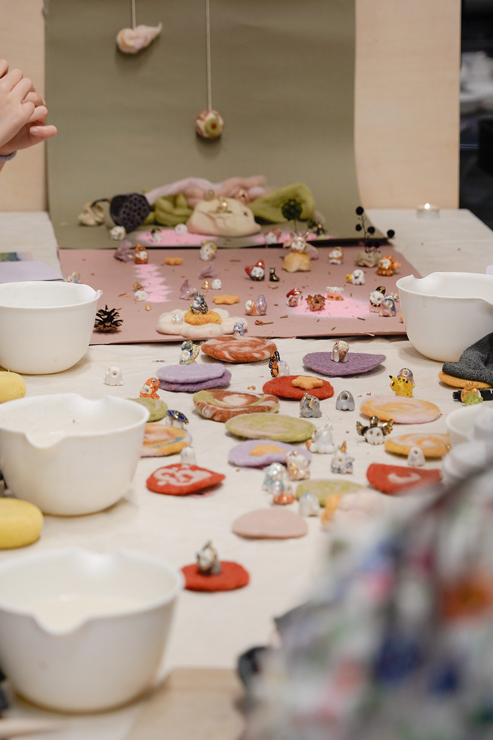 within the installation of Alchemy Arcade, this translation extends into motion, play, and encounter. designed as a tabletop field of prompts and relics, the work invites participants to traverse an imaginative terrain mapped by chance. guided by a ceramics "spirit companion" chosen from Seiu's evolving archive of ghost forms, they cast dice, move through embroidered patches, draw cards, ad follow cryptic instructions--each an activation of intuition and embodied cognition. in this shifting space, the line between artwork and psyche begins to blur: symbols answer questions, gestures echo thoughts, and the journey outward becomes a mirror of the mind's inward unfolding.