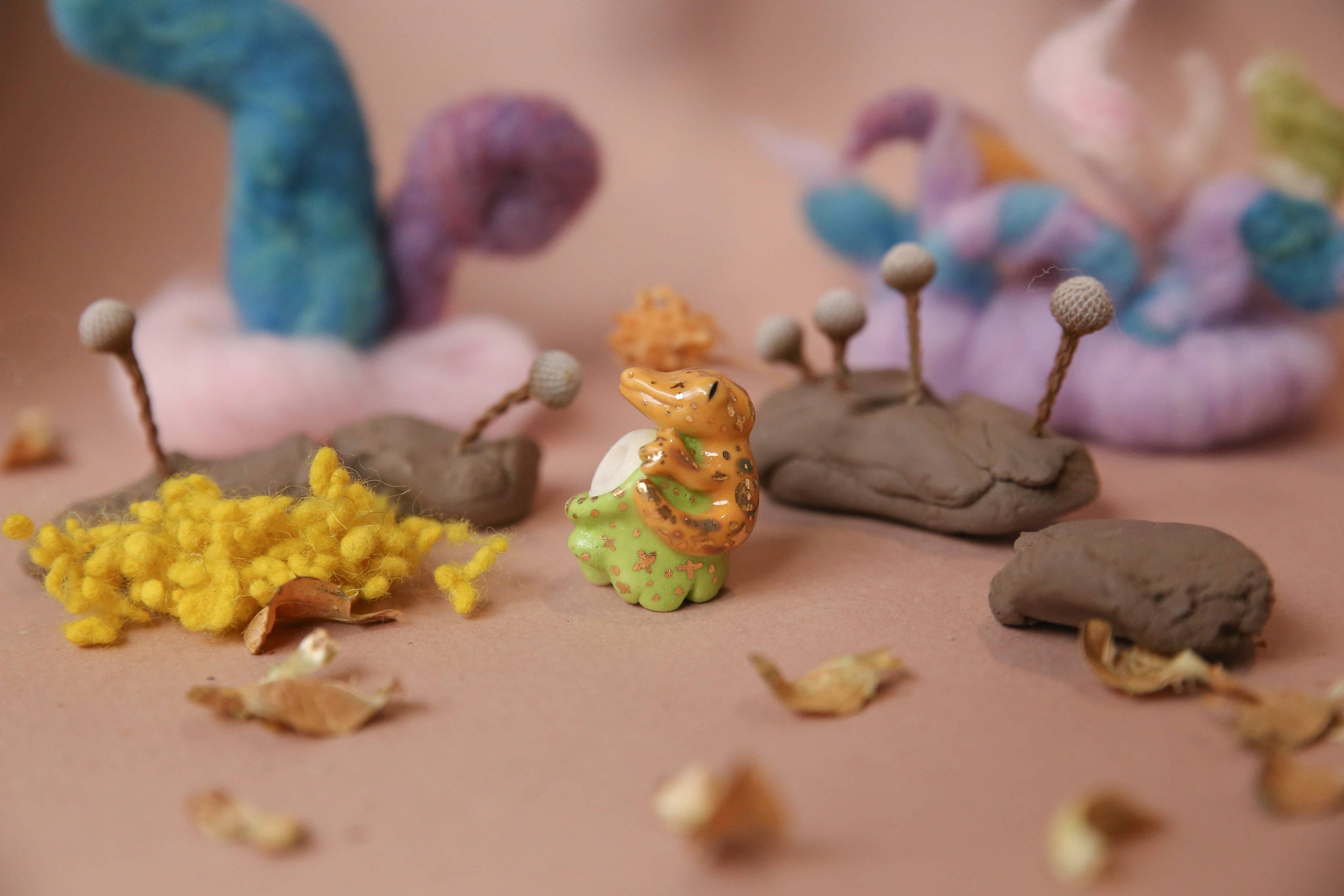 this collection explores how play and attention can rewire memory: how the body remembers before langauge, and how tenderness can reorganize patterns of fear. through its small guardians and alien terrains, planet FIVE studies conciousness as a tactile field--where the simple act of forming becomes a way of hearing the self return.